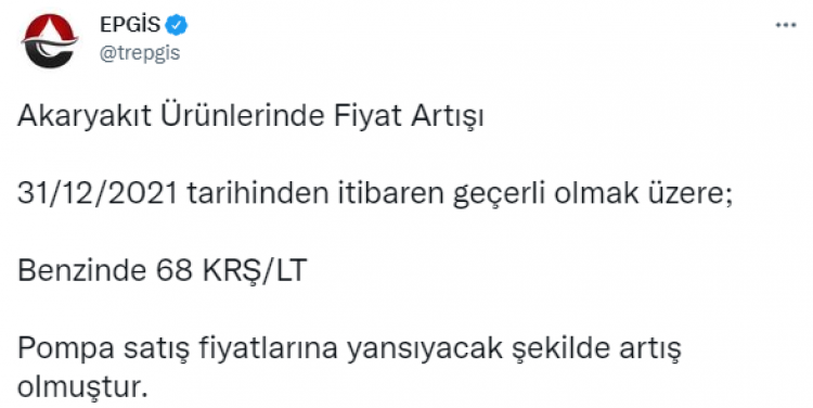 Benzinin litre fiyatına gece yarısından geçerli olmak üzere 68 kuruş zam geldi. Enerji Petrol Gaz İkmal İstasyonları İşveren Sendikası (EPGİS), zamlı tarifenin 31 Aralık'tan itibaren geçerli olacağını bildirdi.