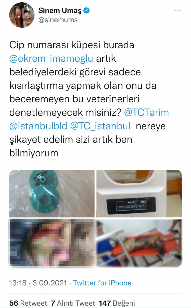 Yaşanan skandal sonucu sosyal medyadan tepki gösteren hayvansever Sinem Umaş, "Sayın Ekrem İmamoğlu asla bizi muhatap almıyor, şehrinde yaşayan hiç bir hayvanla ilgilenmiyor. Her şey çok güzel olacak dediğim güne lanet ettim” ifadelerini kullandı.