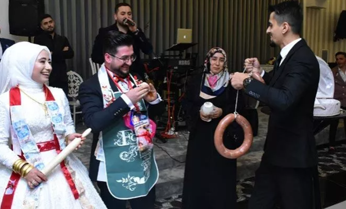 Düğünde takı merasiminde ise damada takılan yiyecek ve eşyalardan oluşan takılar, şaşkınlık yarattı. Damat Harun Baykal'a arkadaşları, 2 kangal sucuk, emzik, önlük, yüzey temizleyicisi, merdane, bulaşık deterjanı gibi ürünleri taktı. Bu durum davetliler arasında gülüşmelere de neden oldu.