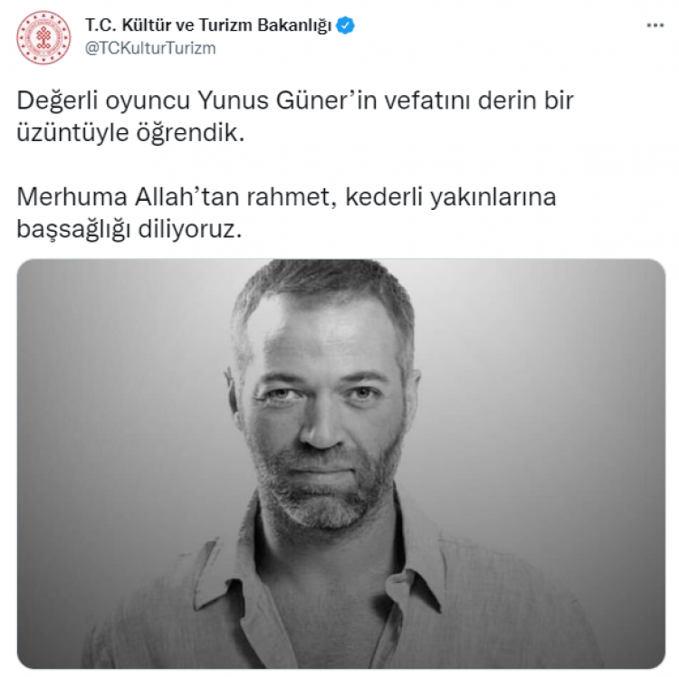 Kültür ve Turizm Bakanlığı, oyuncu Yunus Güner'in hayatını kaybettiğini açıkladı.