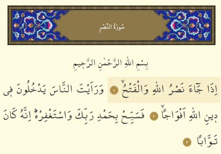 Okunuşu: Bismillâhi'r-Rahmâni'r-Rahîm. 1- "İzâ câe nasrullâhi ve'l-fethu. 2- Ve raeyte'n-nâse yedhulûne fî dînillâhi efvâcâ. 3- Fe sebbih bi-hamdi Rabbike vestağfirhu innehû kâne tevvâbâ.