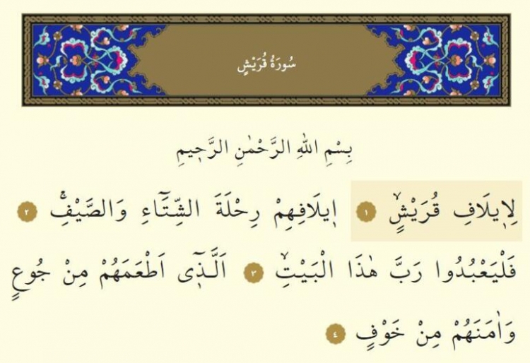 Okunuşu: Bismillâhi'r-Rahmâni'r-Rahîm. 1- Li îlâfi kurayş. 2- Îlâfihim rihlete'ş-şitâi ve's-sayf. 3- Felya'budû Rabbe hâze'l-beyt. 4- Ellezî et'amehum min cû'in ve âmenehum min havf.