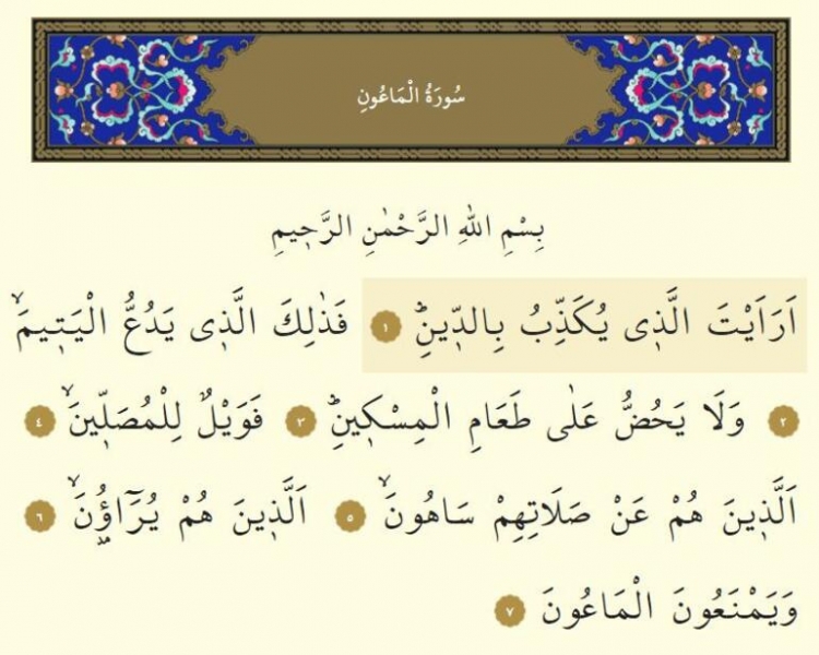 Okunuşu: Bismillâhi'r-Rahmâni'r-Rahîm. 1- "Eraeytellezî yukezzibu bi'd-dîn. 2- Fezâlike'l-lezî yedu'ul-yetîm. 3- Ve lâ yehuddu alâ ta'âmi'l-miskîn. 4- Feveylun lil-musallîn. 5- Ellezînehum an salâtihim sâhûn. 6- Ellezînehum yurâûn. 7- Ve yemne'ûne'l-mâ'ûn.