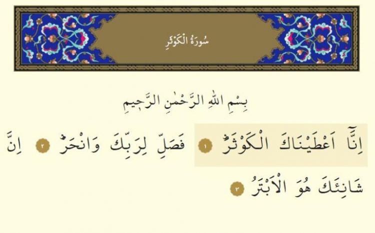 Anlamı: —Rahmân ve Rahîm olan Allah'ın adıyla. 1- "Şüphesiz biz sana Kevser'i verdik. 2- Öyleyse Rabbin için namaz kıl ve kurban kes. 3- Asıl sonu kesik olan, senin düşmanın (sana buğzeden)dir