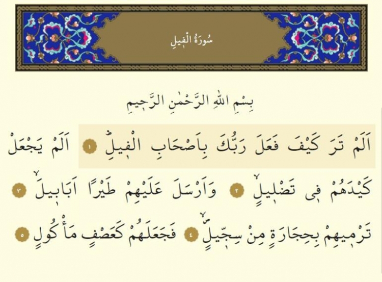 Okunuşu: Bismillâhi'r-Rahmâni'r-Rahîm. 1- "Elemtera keyfe fe'ale Rabbuke bi-ashâbi'l-fîl. 2- Elem yec'al keydehum fî tadlîl. 3- Ve ersele 'aleyhim tayran ebâbîl. 4- Termîhim bi-hicâratin min siccîl. 5- Fece'alehum ke'asfin me'kûl.