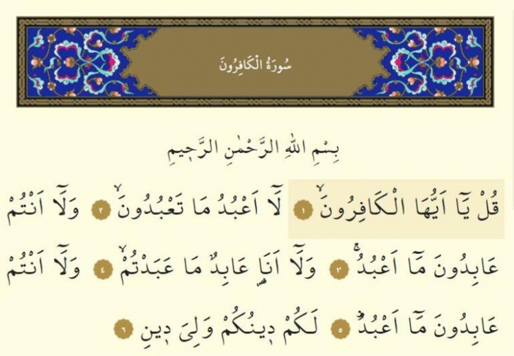 Anlamı: —Rahmân ve Rahîm olan Allah'ın adıyla. 1- "De ki: Ey kâfirler. 2- Ben sizin taptıklarınıza tapmam. 3- Siz de benim ibadet ettiğime ibadet edecek değilsiniz. 4- Ben de sizin taptıklarınıza tapacak değilim. 5- Siz de benim ibadet ettiğime, ibadet edecek değilsiniz. 6- Sizin dininiz size, benim dinim bana.
