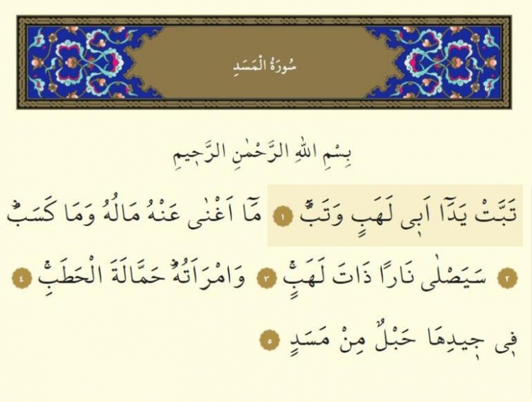 Okunuşu: Bismillâhi'r-Rahmâni'r-Rahîm. 1- "Tebbet yedâ ebî lehebin ve tebb. 2- Mâ ağnâ 'anhu mâluhû ve mâ keseb. 3- Seyaslâ nâran zâte leheb. 4- Vemraetuhû hammâlete'l-hatab. 5- Fî cîdihâ hablun min mesed.
