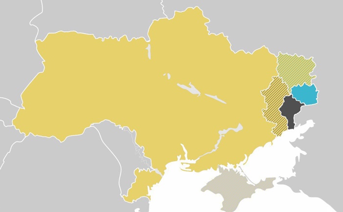 Grafikte Rusya destekli güçlerin kontrolündeki Donetsk (siyah) ve Luhansk (mavi) bölgeler yer alıyor. Taralı alanlar ise bu iki bölgenin -şu an için- Ukrayna kontrolündeki kısımlarını gösteriyor.