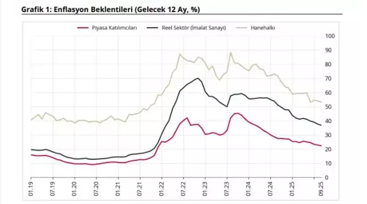 TCMB, Eylül 2025 dönemine ilişkin sektörel enflasyon beklentilerini açıkladı. Buna göre; 12 ay sonrası yıllık enflasyon beklentileri bir önceki aya göre, piyasa katılımcıları için 0,59 puan azalarak yüzde 22,25 seviyesine, reel sektör için 0,90 puan azalarak yüzde 36,80 seviyesine, hanehalkı için 1,08 puan azalarak yüzde 52,99 seviyesine geriledi. Gelecek 12 aylık dönemde enflasyonun düşeceğini bekleyen hanehalkı oranı, bir önceki aya göre 0,20 puan azalarak yüzde 27,35 seviyesinde gerçekleşti.