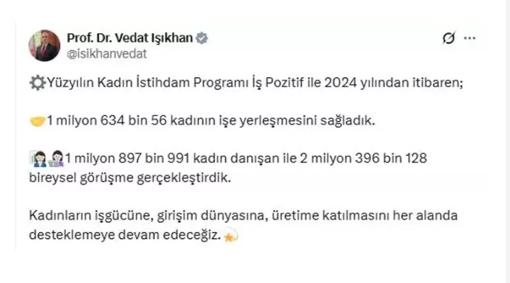 Çalışma ve Sosyal Güvenlik Bakanı Vedat Işıkhan, "Yüzyılın kadın istihdam programı İş Pozitif ile 2024 yılından itibaren 1 milyon 634 bin 56 kadının işe yerleşmesini sağladık" dedi.