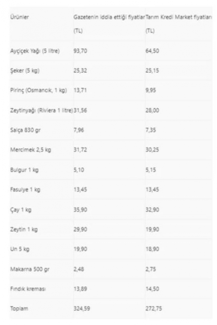 Yine bir başka günlük gazetede ise 'Fiyatlar Gayet Uygun Değilmiş' manşetiyle verilen haberde, Tarım Kredi Kooperatif marketlerdeki fiyatların incelendiği belirtilerek şirketimizin marketlerine ait olduğu iddia edilen fiyatlar üzerinden yanlış ve yanıltıcı bir haber yapılmıştır. İnternet sitemiz ve sosyal medya hesaplarımızdan da duyurduğumuz üzere belirtilen fiyatlar, Tarım Kredi Kooperatif marketlerin gerçek fiyatlarını yansıtmamaktadır."