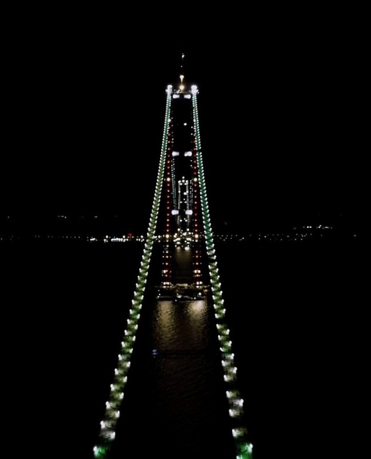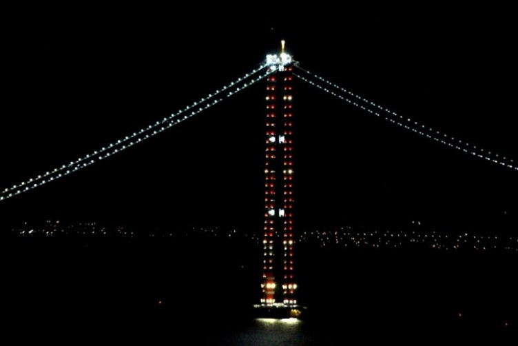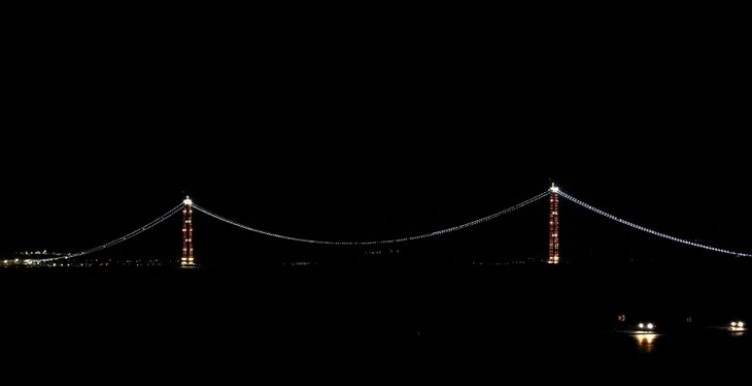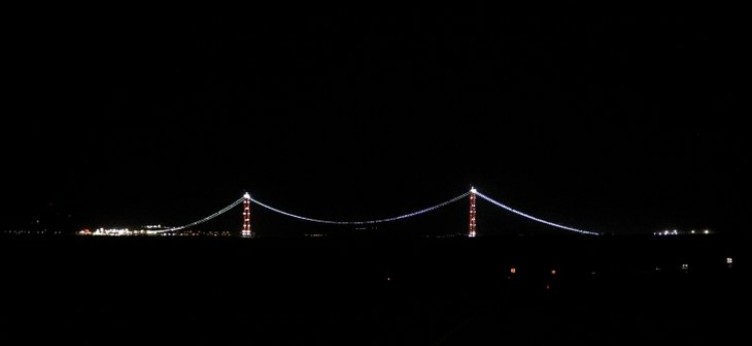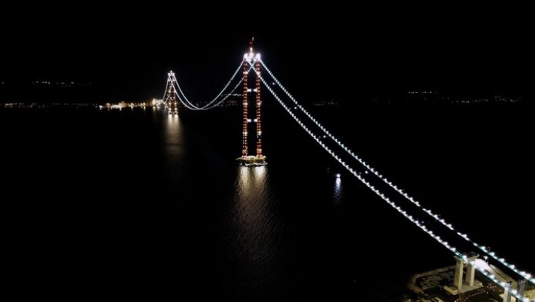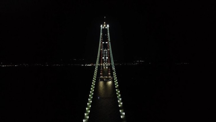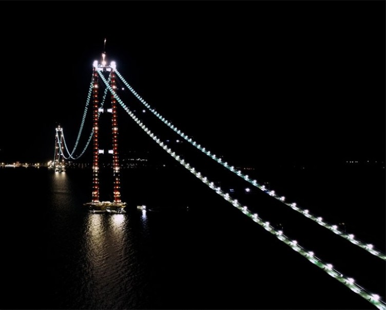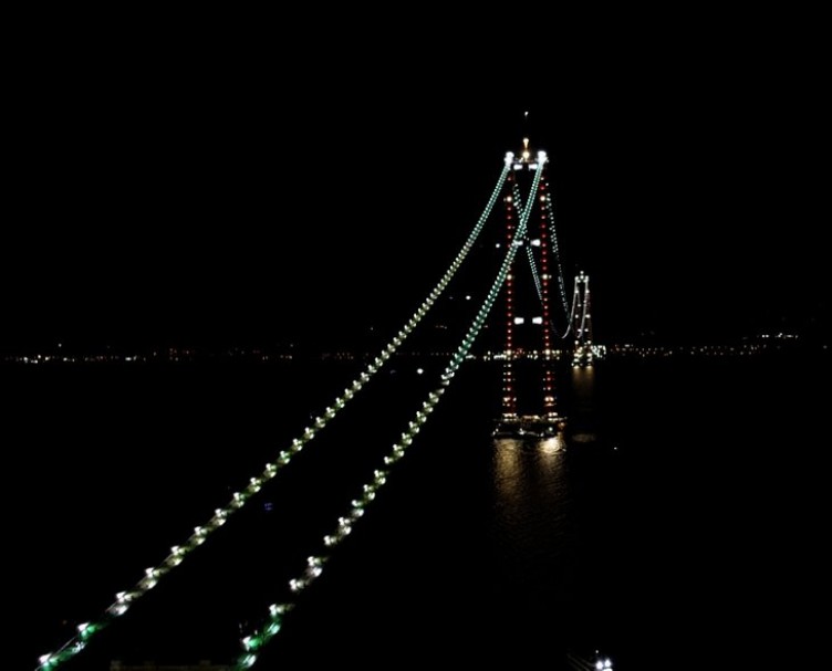 Dünyanın en büyük orta açıklıklı asma köprüsü olan 1915 Çanakkale Köprüsü'nde çalışmalar tüm hızıyla sürüyor. Ekonomik ve stratejik açıdan büyük bir öneme sahip olan köprünün geçen ay tamamlanan 'kedi yolu'ndaki ışıklandırmalar geceyi aydınlatarak estetik bir görünüm sağlıyor.