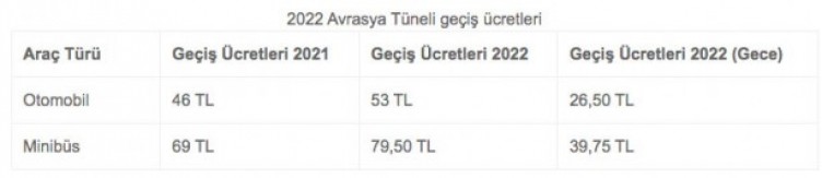 2022 AVRASYA TÜNELİ GEÇİŞ ÜCRETİ İstanbul Avrasya Tüneli'nde otomobil geçiş ücreti 2022 yılı boyunda her gün 05.00-23.59 saatleri arasında tek yönde 53 TL, 00.00-05.00 saatleri arasında yüzde 50 indirimli olarak yine tek yönde 26.50 TL olarak belirlendi.