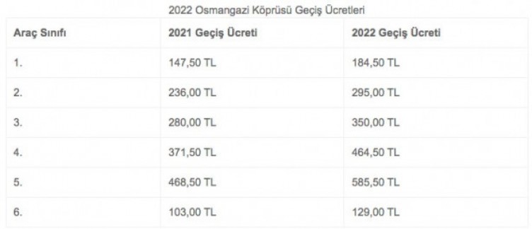 2022 İstanbul-İzmir Köprü ve Otoyol Geçiş Ücretleri -1. sınıf araçlar için Osmangazi Köprüsü 147,50 TL, Bursa 179 TL, Manisa- Turgutlu 349 TL, İzmir 367 TL -2. sınıf araçlar için Osmangazi Köprüsü 236 TL, Bursa 286 TL, Manisa- Turgutlu 558 TL, İzmir 586,50 TL -3. sınıf araçlar için Osmangazi Köprüsü 103 TL, Bursa 125 TL, Manisa- Turgutlu 244 TL, İzmir 256,50 TL -4 . sınıf araçlar için Osmangazi Köprüsü 280 TL, Bursa 339,50 TL, Manisa- Turgutlu 662,50 TL, İzmir 696,50 TL