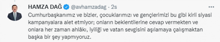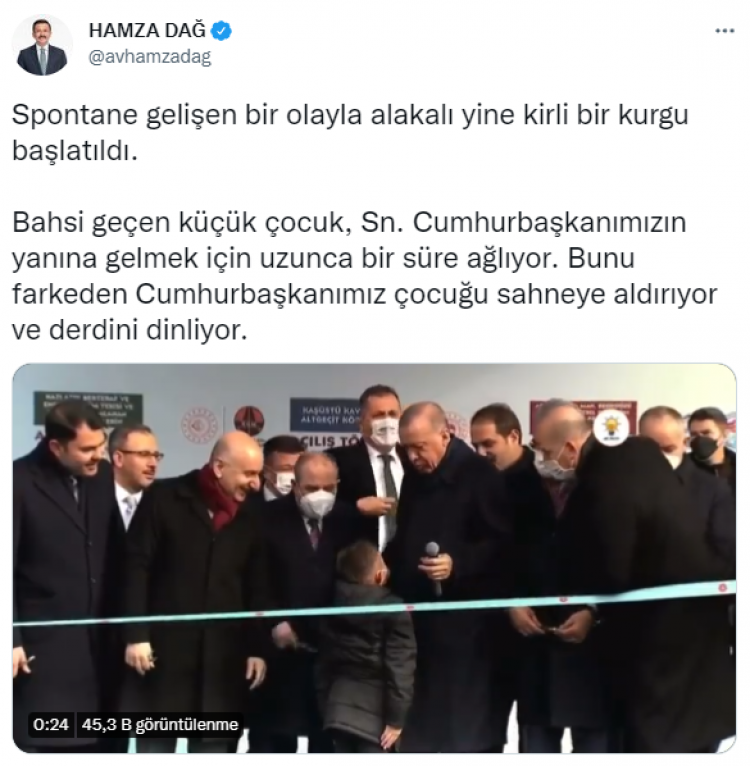 Dağ, "Spontane gelişen bir olayla alakalı yine kirli bir kurgu başlatıldı. Bahsi geçen küçük çocuk, Sayın Cumhurbaşkanımızın yanına gelmek için uzunca bir süre ağlıyor. Bunu fark eden Cumhurbaşkanımız çocuğu sahneye aldırıyor ve derdini dinliyor. Kendi ideolojik yaklaşım veya siyasal tercihleri olduğunda çocukları 'Planlı ve stratejik' şekilde kullanarak istismar edenlerin, bir çocuğun 'Plansız ve öğretilmeden' sarf ettiği sözler için manipülasyon düğmesine basması, çaresizlik ve acizliktir." ifadelerini kullandı.