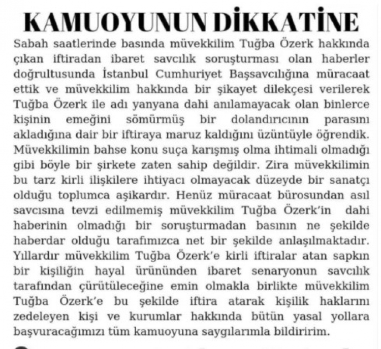 "Sabah saatlerinde basında müvekkilim Tuğba Özerk hakkında çıkan iftiradan ibaret savcılık soruşturması olan haberler doğrultusunda İstanbul Cumhuriyet Başsavcılığına müracaat ettik ve müvekkilim hakkında bir şikayet dilekçesi verilerek Tuğba Özerk ile adı yan yana dahi anılamayacak olan binlerce kişinin emeğini sömürmüş bir dolandırıcının parasını akladığına dair bir iftiraya maruz kaldığını üzüntüyle öğrendik. Müvekkilimin bahse konu suça karışmış olma ihtimali olmadığı gibi böyle bir şirkete zaten sahip değildir. "