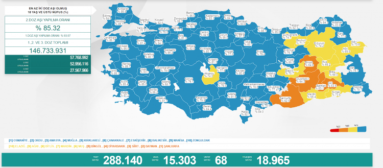 Bakanlığın açıkladığı verilere göre Türkiye'de son 24 saatte, 288 bin 140 test yapıldı; 15 bin 303 vaka tespit edildi; 68 kişi vefat etti; 18 bin 965 kişi de sağlığına kavuştu.