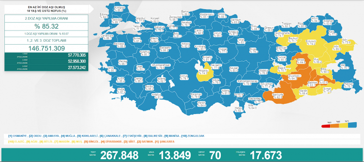 Bakanlığın açıkladığı verilere göre Türkiye'de son 24 saatte, 267 bin 848 test yapıldı; 13 bin 849 vaka tespit edildi; 70 kişi vefat etti; 17 bin 673 kişi de sağlığına kavuştu.
