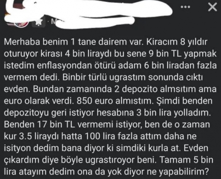 Ev sahibi olduğunu belirten bir vatandaşın yaptığı paylaşım sosyal medyayı adete ikiye böldü. Kiracısı ile arasında yaşananları anlatan ev sahibi, "Ne yapabilirim?" diyerek vatandaşlardan yardım istedi.