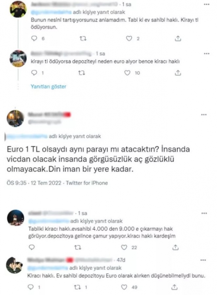Ev sahibinin yaptığı paylaşıma çok sayıda yorum gelirken kullanıcılardan bazıları kirayı TL olarak ödediği için depozitonun da TL olarak geri verilmesi gerektiğini savundu. Bir kesim vatandaş ise "Euro 1 TL olsaydı güncel kurdan mı depozitoyu geri verecektin?" diyerek kiracıyı haklı buldu.