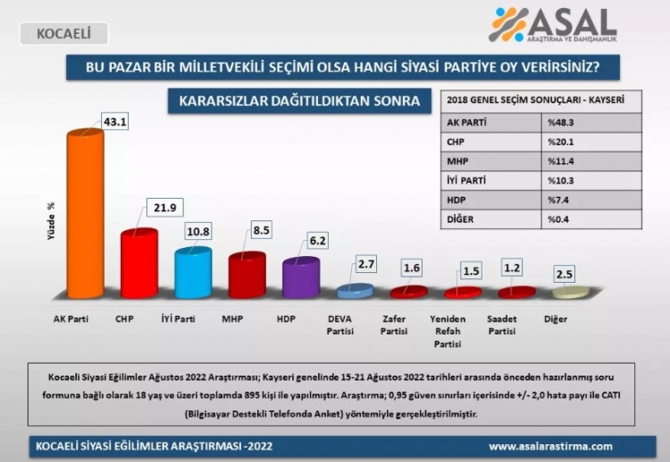 ASAL Araştırma ve Danışmanlık Şirketi, Siyasi Eğilimler Araştırması Ağustos ayı anket çalışmasını Kayseri, Kocaeli, Gaziantep ve Malatya’da gerçekleştirdi. ,