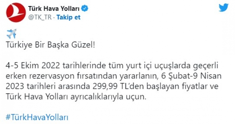 Türk Hava Yolları 4-5 Ekim 2022 tarihinde alınan tüm yurt içi uçuşlarda geçerli erken rezervasyon kampanyası düzenledi. 6 Şubat-9 Nisan 2023 tarihleri arasındaki uçuşlarda biletlemeler geçerli olacak. Fiyat olarak da 299,99 lira belirlendi.