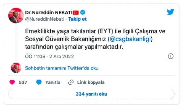 Hazine ve Maliye Bakanı Nureddin Nebati EYT ile ilgili sosyal medya hesabından son dakika açıklamalarda bulundu. Bakan Nebati, EYT’liler ile ilgili Çalışma ve Sosyal Güvenlik Bakanlığı tarafından çalışmaların yapıldığını hatırlatarak, işverenlerin karşılaşacağı kıdem tazminatı yükünü, uygun finansman koşullarıyla Hazine destekli KGF kefaleti ile karşılayabilecekleri kredi paketi konusunda Hazine ve Maliye Bakanlığınca hazırlıkların başlatıldığını bildirdi.