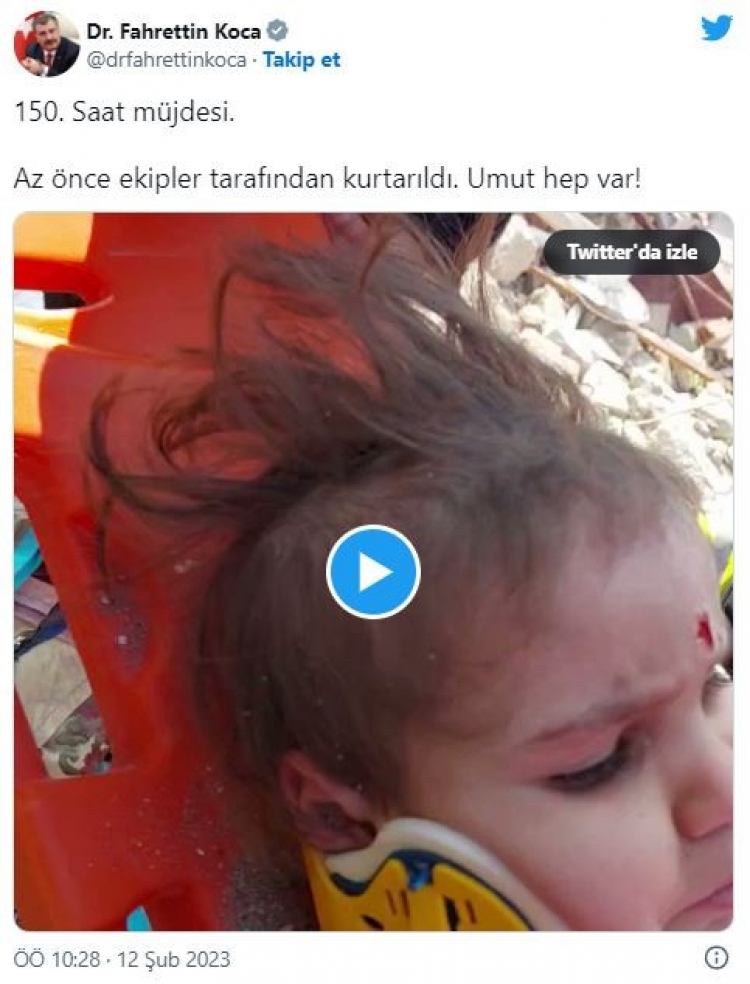 Sağlık Bakanı Fahrettin Koca, Kahramanmaraş merkezli depremlerin ardından arama kurtarma çalışmaları kapsamında felaketin 150. saatinde enkazdan canlı olarak çıkarılan kız çocuğunun görüntülerini paylaşarak, "Umut hep var" ifadesini kullandı.