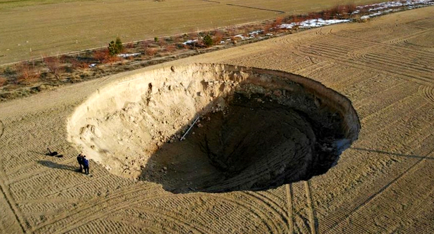 Konya’nın Karapınar ilçesinde yaklaşık 37 metre çapında, 12 metre derinliğinde obruk oluştu. Konya Teknik Üniversitesi Obruk Uygulama ve Araştırma Merkezi Müdürü Prof. Dr. Fetullah Arık, "Üstteki örtü tabakasının ağırlaşması ve obruk oluşumunu etkileyen önemli nedenlerden bir tanesi deprem" dedi.