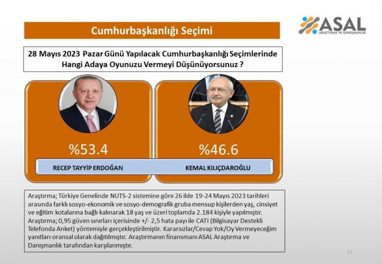 ASAL Araştırma ve Danışmanlık Şirketi tarafından yapılan ankette; Farklı sosyo-ekonomik ve sosyo-demografik gruba mensup kişilerden yaş,cinsiyet ve eğitim kotalarına bağlı kalınarak yapılan araştırmada, verilerinin kontrolleri ve bilgisayar analizi yapılmasının ardından kararsızlar, sandığa gitmeyeceğim ve hiçbiri yanıtları oransal olarak dağıtıldıktan sonra Cumhur İttifakının adayı Recep Tayyip Erdoğan'ın oy oranı yüzde 53.4 ve Millet ittifakının adayı Kemal Kılıçdaroğlu'nun oy oranı ise yüzde 46.6 çıktı.