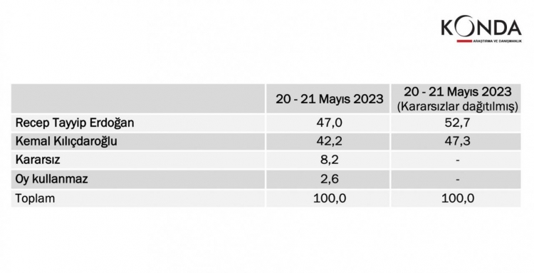 Bilindiği gibi muhalif anket şirketi 'KONDA Araştırma' 14 Mayıs seçimlerine kadar olan süre zarfında ilk tur seçimlerine çok uzak rakamlar içeren anket sonuçları yayımlamıştı.