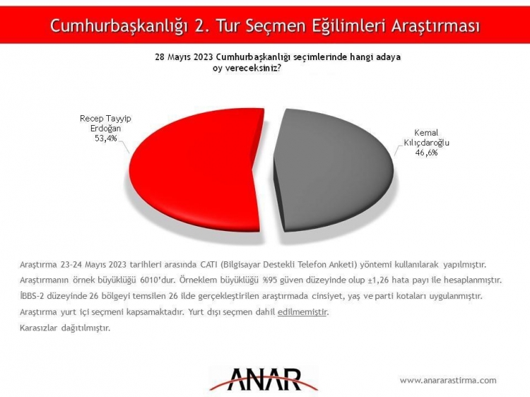 ANAR anket şirketi Cumhurbaşkanlığı 2. Tur Seçmen Eğilimleri Araştırmasını yayınladı. "28 Mayıs 2023 Cumhurbaşkanlığı seçimlerinde hangi adaya oy vereceksiniz?" sorusunun sorulduğu ankette Başkan Recep Tayyip Erdoğan yüzde 53.4 alırken yedili masanın adayı Kemal Kılıçdaroğlu yüzde 46.6'da kaldı.