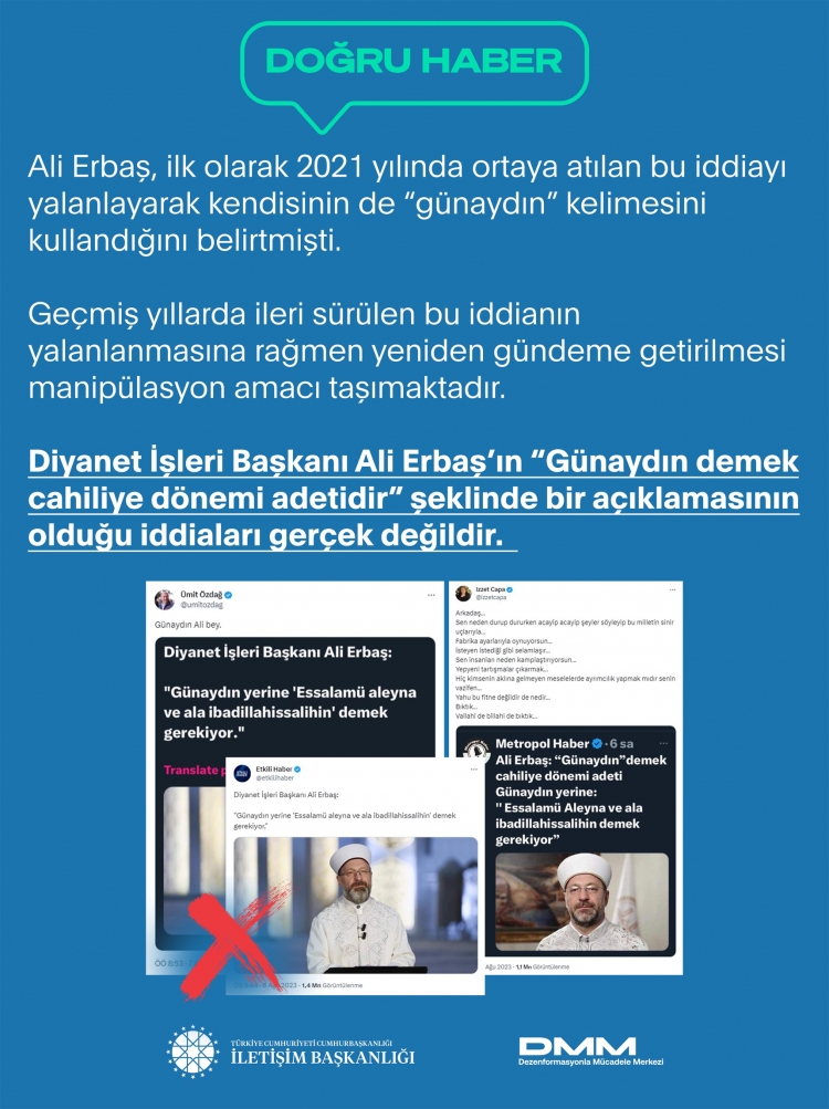 Cumhurbaşkanlığı İletişim Başkanlığı Dezenformasyonla Mücadele Merkezi, sosyal medya hesabından, Diyanet İşleri Başkanı Ali Erbaş'ın "Günaydın demek cahiliye dönemi adetidir" şeklinde bir açıklamasının gerçeği yansıtmadığını bildirdi.