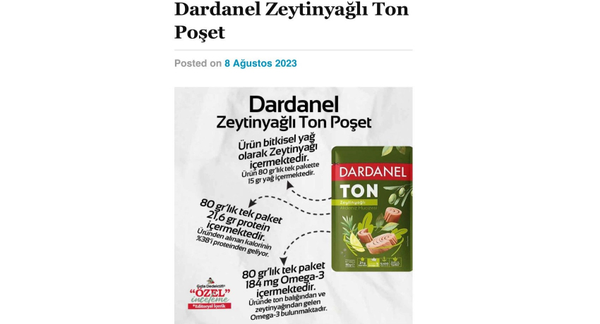 “Market raflarında genel olarak konservede görmeye alıştığımız ton balıklarını tek kullanımlık pratik paketlerde de görüyoruz. Bugün özel inceleme kapsamında Dardanel Zeytinyağlı Ton Balığı ürününü 80 gr’lık poşet ambalaj üzerinden inceleyeceğiz. Ürünün konserveye benzer şekilde yaklaşık 2,5 yıl raf ömrü olduğu görülüyor. İlk olarak üründe ton balığı, zeytinyağı ve tuz haricinde herhangi bir bileşen bulunmadığını görüyoruz. Üründeki ton balığı ve zeytinyağı oranları yüzdesel olarak beyan edilmezken, besin değerleri tablosunda 100 gr’da 18,8 gr yağ bulunduğunu anlıyoruz. Bu oranın kısmen ton balığından gelen yağ ile birlikte zeytinyağı oranını olduğunu söyleyebiliriz. Diğer yandan üründe zeytinyağından gelen düşük doymuş yağın etkisiyle 100 gr’da 3,1 gr doymuş yağ bulunuyor. Ürün bu haliyle 80 gr’lık tek pakette 15 gr yağ içerirken, tek paketteki doymuş yağ oranı da 2,5 gr olarak hesaplanıyor. Bu haliyle üründen alınan kalorinin %9,8’i doymuş yağdan geliyor.