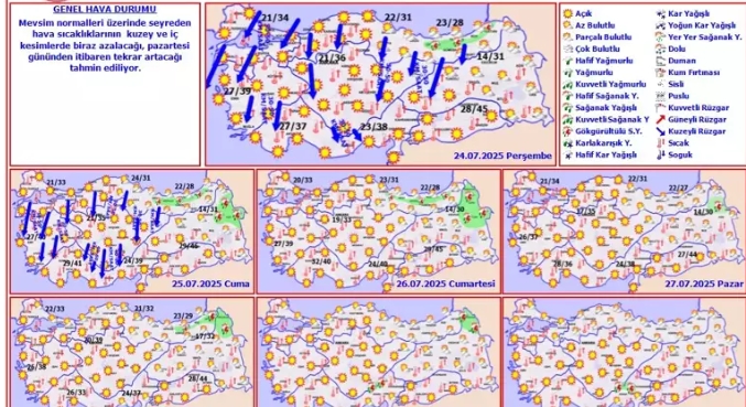 Meteoroloji Genel Müdürlüğü, 24-30 Temmuz tarihlerine ilişkin haftalık hava tahminlerini açıkladı. Buna göre; mevsim normalleri üzerinde seyreden hava sıcaklıkları kuzey ve iç kesimlerde biraz azalacak, pazartesi gününden itibaren tekrar artacak. Bugün, Marmara, Ege, Akdeniz, İç Anadolu, Batı Karadeniz, Güneydoğu ve Anadolu’nun tamamında az bulutlu ve açık havanın etkili olması bekleniyor. Orta ve Doğu Karadeniz Bölgesi’nde, parçalı ve az bulutlu, doğusu yer yer çok bulutlu, öğle saatlerinden sonra Giresun, Trabzon, Rize ve Artvin’in iç ve yüksek kesimleri yerel sağanak ve gök gürültülü sağanak yağışlı geçecek. Doğu Anadolu’da ise, az bulutlu ve açık, kuzeydoğusunun yer yer parçalı ve çok bulutlu, öğle saatlerinden sonra Ardahan çevreleri ile Kars'ın kuzey ilçelerinin yerel sağanak ve gök gürültülü sağanak yağışlı geçeceği tahmin ediliyor.