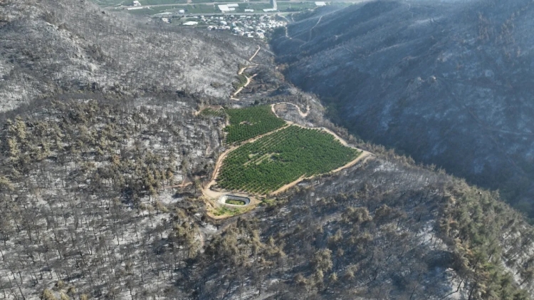 Söndürüldükten sonra tarlama geldiğimde benim burasının yanmadığını gördüm. Benim bu tarlanın yanmamasının sebebi, damlama sistemiyle sulama yapıyorum. Sürekli nemli olması ve ağaçlarımın dibinde kuru ot olmaması çok etkili oldu. Verilmiş sadakamız varmış. O manzarayı bir daha Allah bize yaşatmasın.