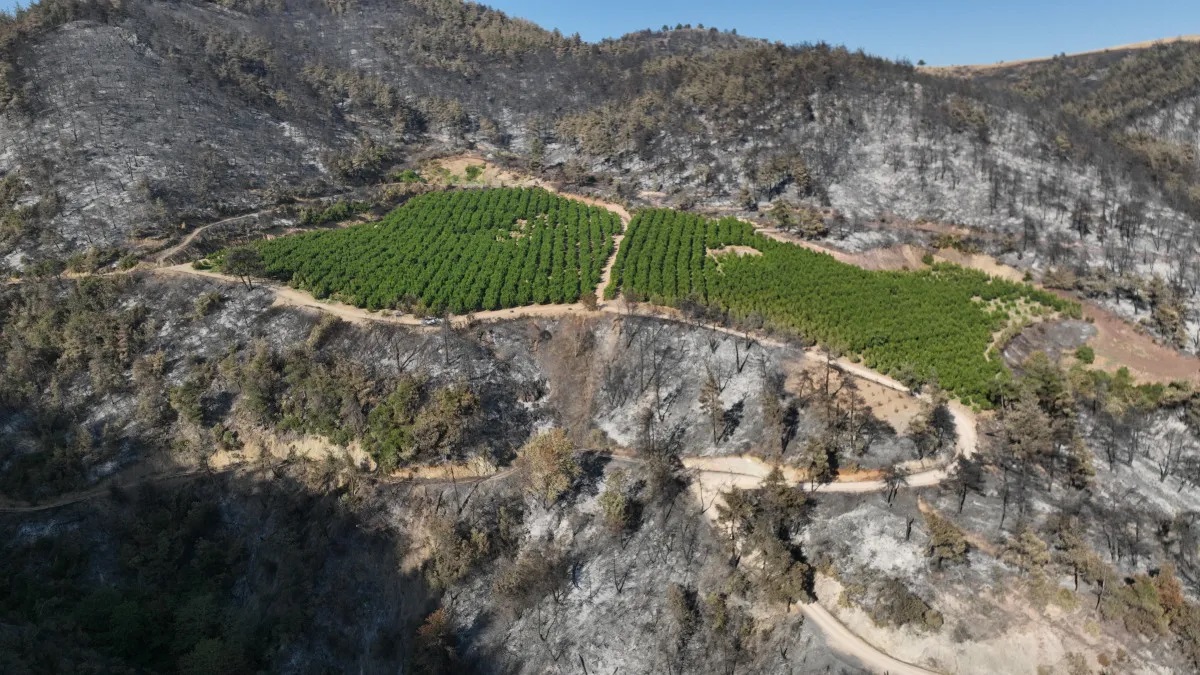 100 hektarlık ormanlık alandaki ağaçların hepsi küle dönerken, ormanın içinde Karahıdır Mahallesi'ndeki nektarın bahçesi, yemyeşil üzerinde meyveleriyle kala kaldı.
