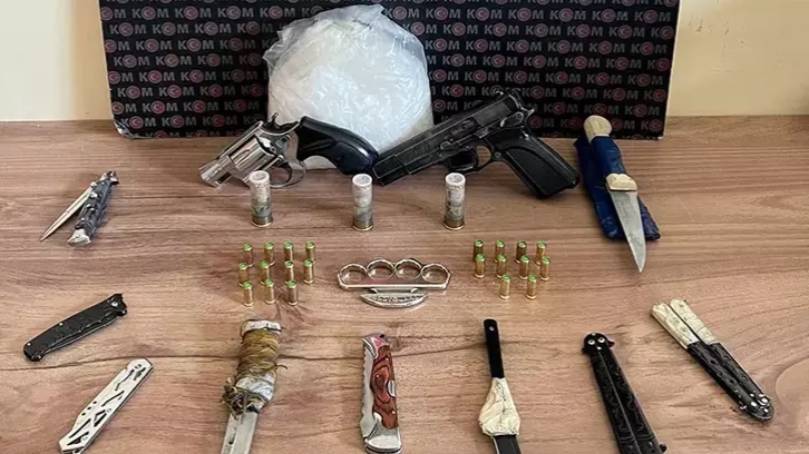 Kaçakçılık ve Organize Suçlarla Mücadele (KOM) Şube Müdürlüğü ekipleri tarafından silah kaçakçılarına yönelik çalışma başlatıldı. Bu kapsamda, belirlenen adreslere sabah saatlerinde yapılan baskınlarda, 2 muşta, 9 bıçak, 2 kurusıkı tabanca, 29 kurusıkı tabanca fişeği, 3 av tüfeği kartuşu ve 1600 gram uyuşturucu madde ele geçirildi. Operasyonda gözaltına alınan 7 şüpheli emniyete götürüldü. Şüphelilerin emniyetteki işlemleri devam ediyor.