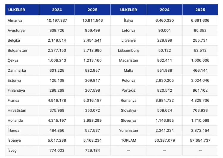 Geçen yılın ilk 6 ayında AB üyesi ülkelere toplamda 53,4 milyar dolar ihracat yapılırken, bu değer 2025'te yüzde 8 artışla 57,7 milyar dolara çıktı.
