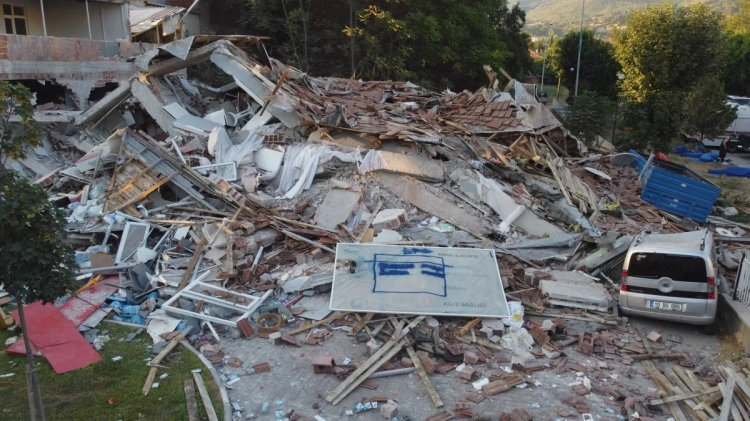 Balıkesir'de yıkılan bina sabahın ilk ışıkları ile havadan görüntülendi