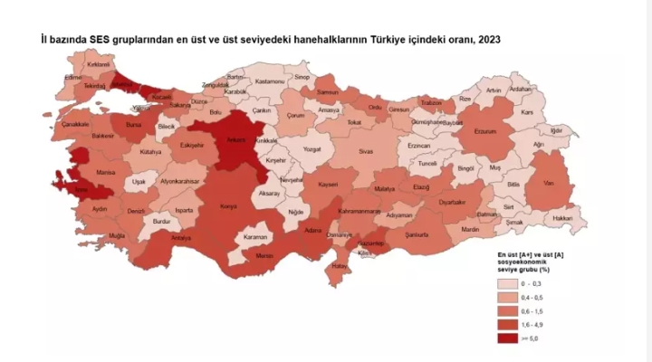 İl düzeyinde en üst ve üst sosyoekonomik seviye gruplarındaki hanehalkları, Türkiye içindeki oranlarına göre sıralandığında, bu seviyelerdeki hanehalklarının en fazla olduğu iller yüzde 28,6 ile İstanbul, yüzde 11,5 ile Ankara, yüzde 6,7 ile İzmir, yüzde 3,9 ile Bursa ve yüzde 3,3 ile Antalya oldu. İlçe düzeyinde en üst ve üst sosyoekonomik seviye gruplarındaki hanehalkları, Türkiye içindeki oranlarına göre sıralandığında, bu seviyelerdeki hanehalklarının en fazla olduğu ilçeler sırasıyla yüzde 4,1 ile Çankaya (Ankara), yüzde 2,4 ile Kadıköy (İstanbul), yüzde 1,9 ile Yenimahalle (Ankara) oldu.
