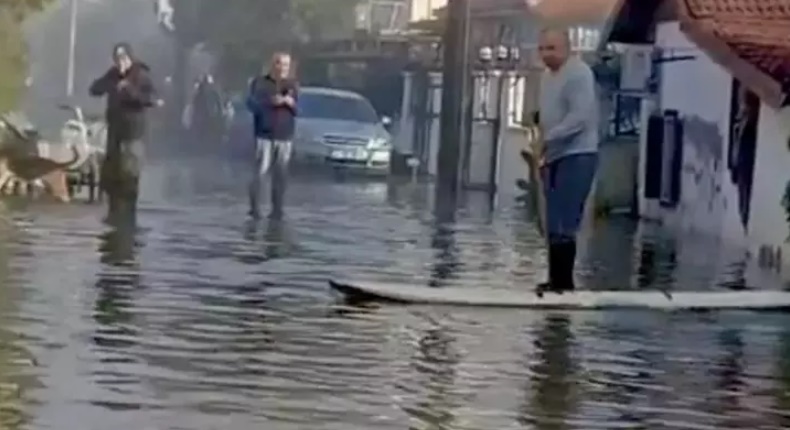 Muğla'da dün etkili olan sağanak nedeniyle cadde ve sokaklar göle döndü. Kentte sağanağın yanı sıra kuvvetli rüzgar ve hortum da etkili olurken, Köyceğiz ilçesinde bir kişinin göle dönen yolda kano ile ilerlediği anlar cep telefonu kamerasıyla görüntülendi.