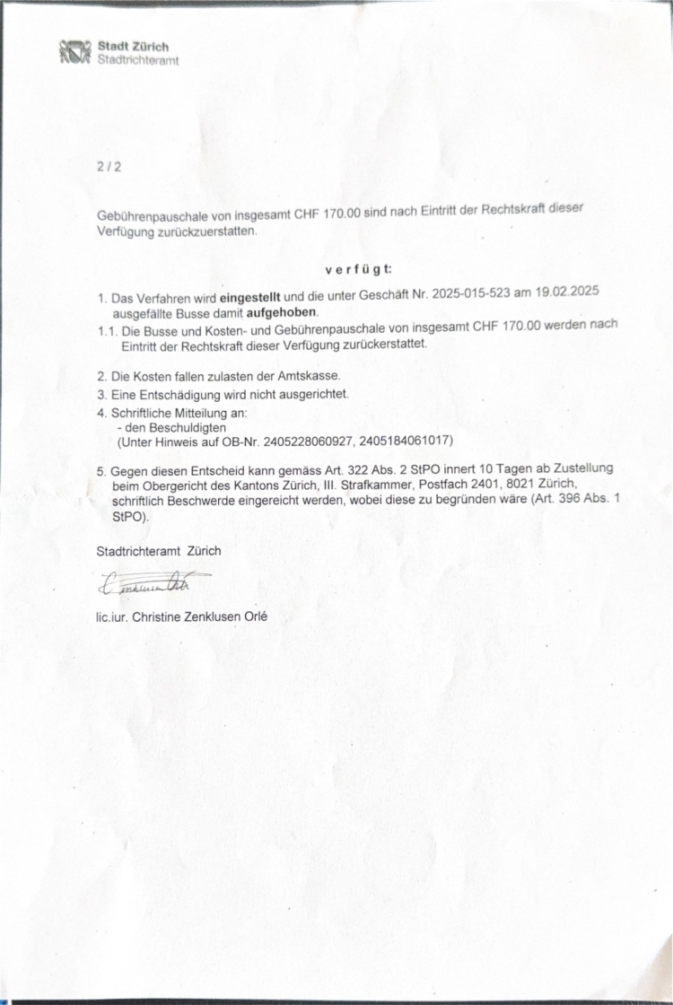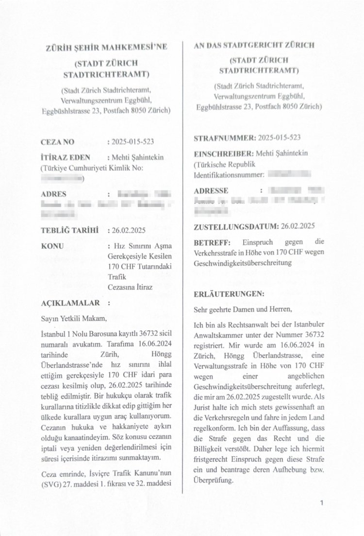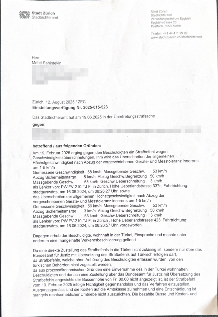 İstanbul’da yaşayan Avukat Mehti Şahintekin’in Zürih’te tatil sırasında kesilen trafik cezasına yaptığı itiraz İsviçre Zürih mahkemesinde kabul edildi. Zürih Şehir Mahkemesi, cezanın usule uygun tebliğ edilmediğine hükmederek dosyayı kapattı ve ödenen cezanın iadesine karar verdi.