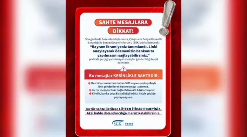SGK’nın sanal medya hesabından yapılan açıklamada, "Son günlerde bazı vatandaşlarımıza, Çalışma ve Sosyal Güvenlik Bakanlığı ile Sosyal Güvenlik Kurumu (SGK) adı kullanılarak; 'Bayram ikramiyeniz tanımlandı. Linki onaylayarak ödemenizin bankanıza yapılmasını sağlayabilirsiniz' şeklinde gerçeği yansıtmayan mesajlar gönderildiği tespit edilmiştir. Bu mesajlar kesinlikle sahtedir. Resmi kurumlar tarafından SMS veya e-posta yoluyla link gönderilerek ödeme onayı istenmez. Bu tür mesajlardaki bağlantılara asla tıklamayınız. Kimlik, banka veya kişisel bilgilerinizi hiçbir şekilde paylaşmayınız. Bu tür sahte iletilere lütfen itibar etmeyiniz. Aksi halde dolandırıcılığa maruz kalabilirsiniz. Şüpheli durumlarda, ‘ALO 170 Çalışma Hayatı İletişim Merkezi’ni arayabilirsiniz, CİMER üzerinden başvuru yapabilirsiniz ve SGK il müdürlükleri/merkezlerine şahsen başvurabilirsiniz” ifadelerine yer verildi.