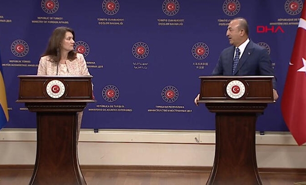 İsveç Dışişleri Bakanı Ann Linde ile ortak basın toplantısı düzenleyen Dışişleri Bakanı Mevlüt Çavuşoğlu, mevkidaşına tepki göstererek "Diplomaside 'urge' kelimesini kullanmak tepeden bakmaktır. Bunu diyemezsiniz. Siz hangi yetkiyle Türkiye'nin Suriye'den çekilmesini istiyorsunuz. Neden PKK’ya YPG’ye destek veriyorsunuz?" diye konuştu.