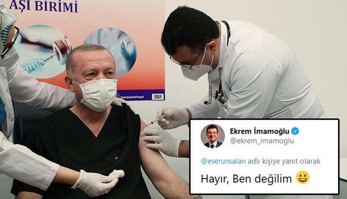 Erdoğan aşı olurken çekilen fotoğraflarda, aşıyı yapan sağlık görevlisinin Ekrem İmamoğlu'na benzeten sosyal medya kullanıcıları çok sayıda esprili paylaşımda bulundu.