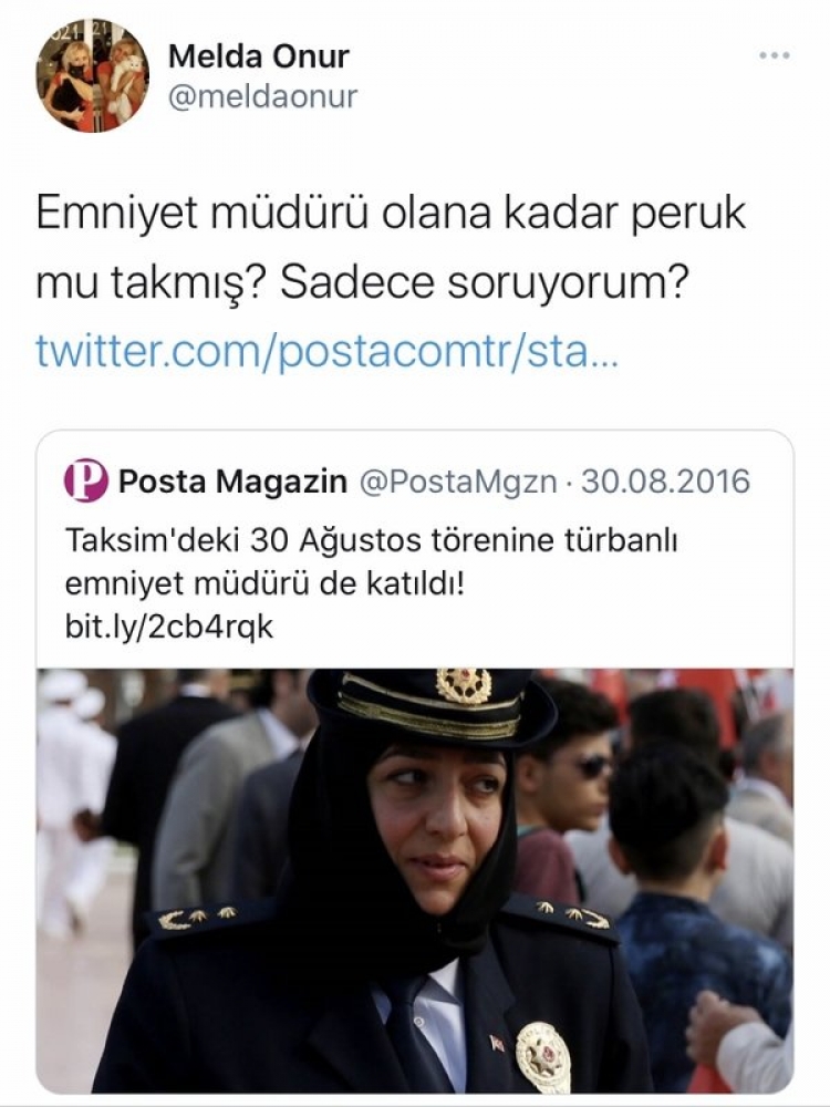 Melda Onur, 30 Ağustos 2016 tarihinde ise, Taksim'deki 30 Ağustos törenine başörtülü emniyet müdürünün katılmasından rahatsız olmuştu ve "Emniyet müdürü olana kadar peruk mu takmış? Sadece soruyorum?" ifadelerini kullanmıştı.