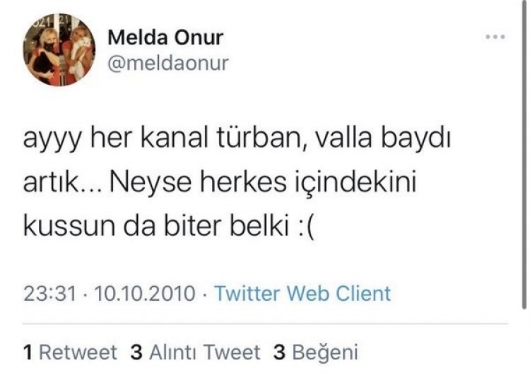 Melda Onur; 10 Ekim 2010 tarihinde yaptığı paylaşımda; "Ayyy her kanal türban, valla baydı artık... Neyse herkes içindekini kussun da biter belki" iddiasında bulundu.