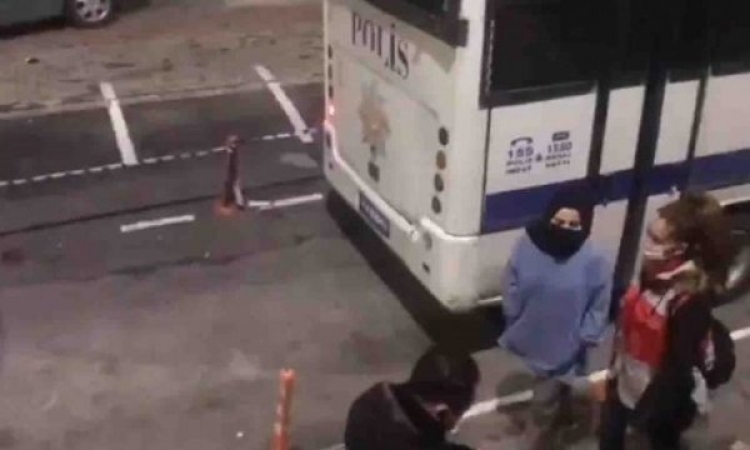 Emniyet Genel Müdürlüğünün sosyal medya hesaplarından paylaşılan videoda, başörtülü öğrenci Şeyma Altundal'ın, eylem sırasında cep telefonuyla ilgilendiği ve gözaltına alındıktan sonra kadın polis eşliğinde emniyete sevk edildiği görüldü.