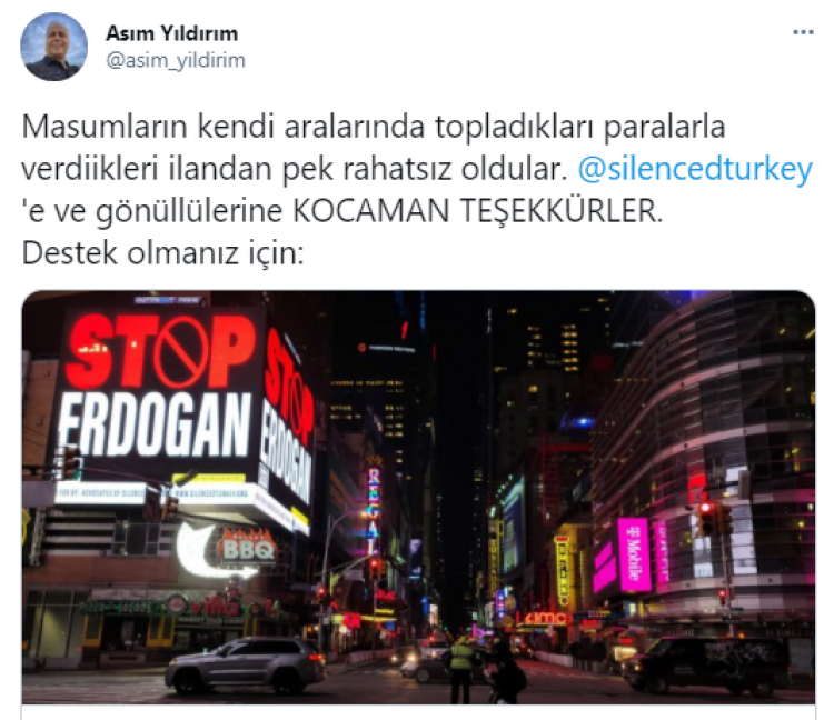 FETÖ borazanı sözde gazeteci Asım Yıldırım, ABD’deki “Stop Erdoğan” reklamlarını aklamaya çalıştı.